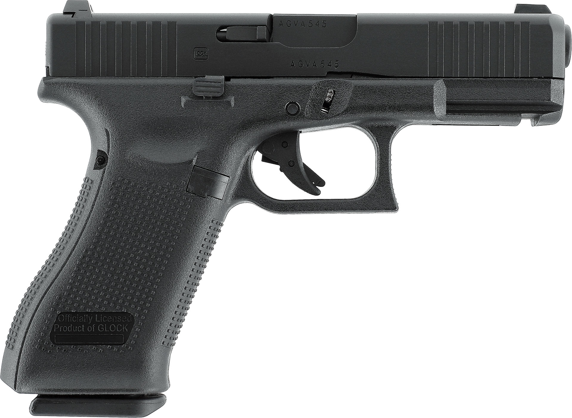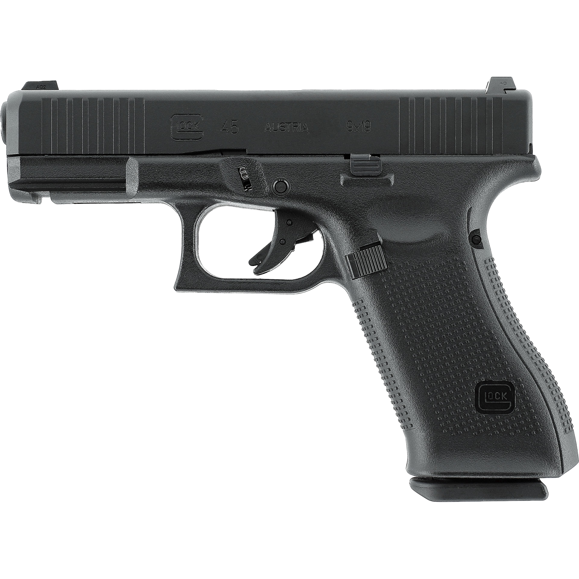 G19X trifft auf Gen5 – Die GLOCK 45 ist das schwarze Modell einer Crossover-Pistole mit dem Fullsize-Griffstück der G17 und dem kompakten Schlitten der G19. Gen5-typisch erhielt sie die Front-Serration im vorderen Bereich des Schlittens und die optimierte Griffstruktur. Als Gas-Airsoft-Variante mit maximal 1 Joule wartet die G45 mit einem von außen einstellbaren Shoot-Up, einem kräftigen Blowback und einem schweren Metallschlitten auf. Die Weaver-Aufnahme lässt den Anbau von taktischem Zubehör zu und mit dem beidseitigen Schlittenfanghebel bekommen auch Linkshänder eine ideale Backup-Waffe.